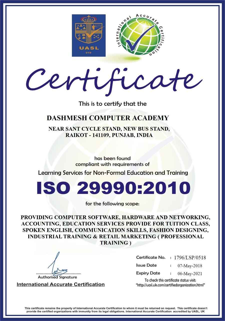 Since 2006, we have created a very friendly learning environment with the latest computer hardware and software technologies. whether you are new to the computer industry or are looking to improve your skills, we have the right course for you. well-qualified, experienced certified instructors train the participants with easy-to-use step by step training material in the most optimized period of time. we provide life time free telephone support to our clients. we are so sure about the quality of our certification that we say: if you register for A+ training and certification, DCA, BASIC, DTP, Tally, etc.